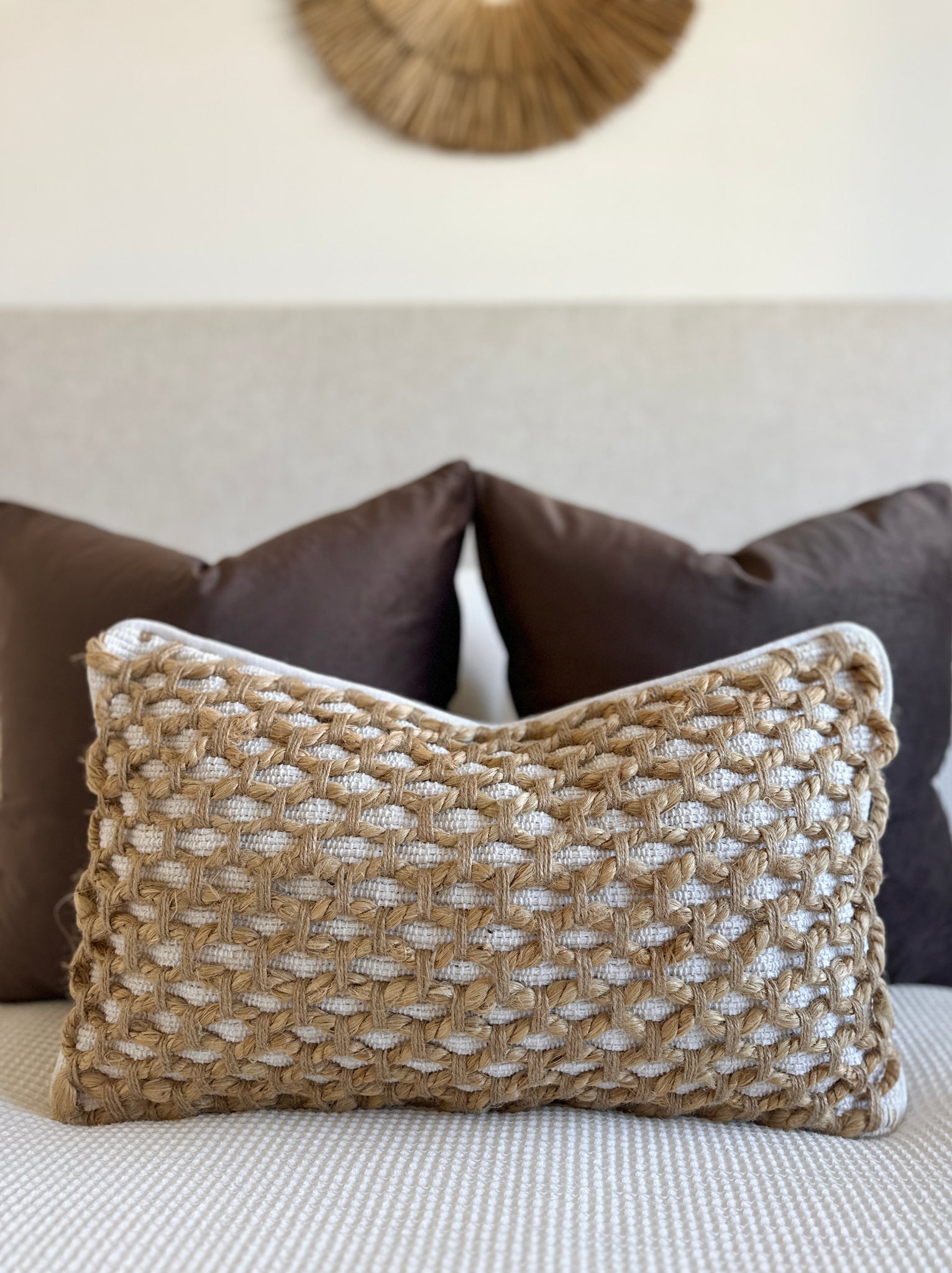 Bring natural texture and effortless warmth to your space with our Tuban Lumbar Pillow Cover. Designed with a beautifully braided jute pattern layered over soft woven cotton, this handcrafted accent pillow adds dimension and depth without overpowering your space.